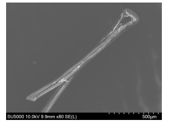 图 1 扫描电子显微镜下显示聚丙烯缝线经过热成型制作 称为囊袋拉钩的细节