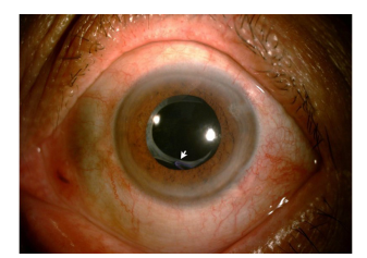 Figure 2 The arrow shows the capsular hook fixated at the anterior capsule by capsular fibrosis