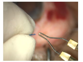 Figure 3-6 The curved needle of the 6-0 polypropylene capsular hook is guided out of the eye using the Docking technique
