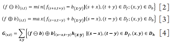 其中公式[2]、公式[3]中,Df和Db分别表示图像输入矩阵f(x,y)和结构矩阵b(x,y)的定义域。公式[4]中,Dh表示核矩阵h(x,y)的定义域。