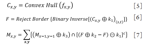 步骤二:去除眼睑毛和高反光点后,容易精准识别出睑板腺的轮廓,通过对Convolution和Morphology改写算法,结合形态学滤波和Convex Hull算法[10],去除无效边缘信息,得到仅剩睑板腺的图像。