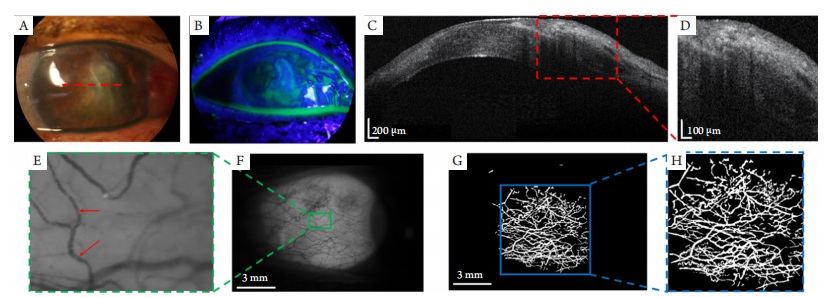 (A) Appearance image of the keratitis patient’s eye; the red dashed line indicates the OCT scanning position; (B) Fluorescein stain image of the keratitis patient; (C, D) OCT image of the inflamed cornea and the zoom-in area showing the highly reflective, inflamed lesion.(E) Screenshots of eye microvascular dynamics in the selected area of conjunctival microvascular network; (F) The bulbar conjunctival vessel network image of the keratitis patient; (G, H) Results of skeletonization of conjunctival microvascular network.