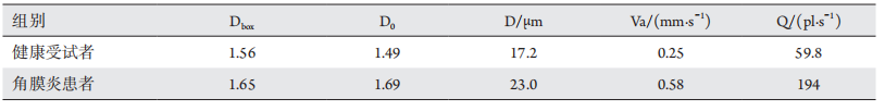 微血管成像模块获取的结膜血管网络图像和动态血流视频,需进一步应用成像算法处理,以提取定量的血流形态学和血流动力学功能参数。图像处理软件的开发已在之前的文献中叙述[31-32]。对于结膜血管网络图像,首先,通过自适应直方图均衡化来提高图像质量,然后通过减去背景图像来进一步增强图像质量;然后,将增强后的图像转换为二值图像,利用骨架化算法得到网络骨架;最后,对血管骨架图像进行分析,计算分形维数复度,提取反应血管网复杂度的分形维数单分形值(Dbox)和反应血管网密度的多重分形(D0)值,用于评价血管密度和复杂性。对于结膜血流影像,首先采用基于球结膜时空图像的运动校正算法,对眼球运动进行补偿,得到配准图像。在对血管图像进行增强和分割后,利用多帧图像的均值,通过计算血管信号轮廓的半高宽(full width at half maxima,FWHM)来测量血管直径(D,μm)。通过分析红细胞的运动,定量结膜血流动力学参数,直接测出轴向血流速度(Va,mm/s),以此计算出截面血流速度,截面血流速度乘以血管横截面积(假设血管为圆形截面,由血管直径计算得出)获得血流量(Q,pl/s)[48]。
