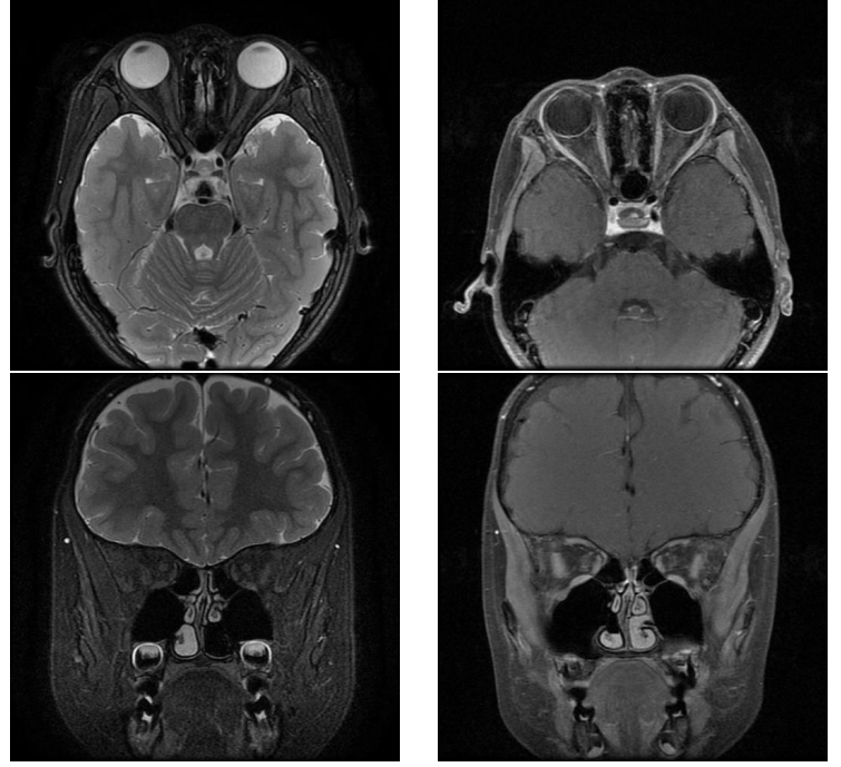 图 3 眼眶 MRI 平扫 + 增强:双眼未见视神经长 T2 及 T1 增强信号
