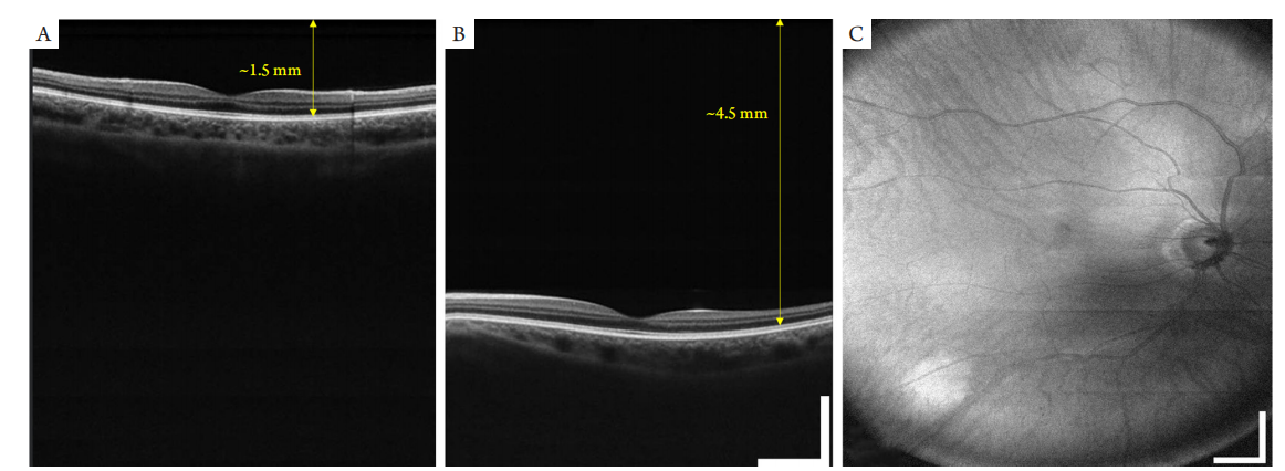 (A,B) OCT images with 6 mm imaging depth. (C) Wide-field SS-OCT results. Images were acquired using a custom-built 200 kHz,1060 nm SS-OCT. Scale bar: 1 mm.
