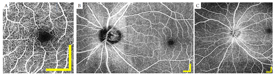 (A) 3 mm × 3 mm OCTA; (B) 7 mm × 12 mm OCTA; (C) 10 mm × 10 mm OCTA. Images were acquired using a custom-built 200 kHz, 1 060 nm SS-OCT. Scale bar: 1 mm.