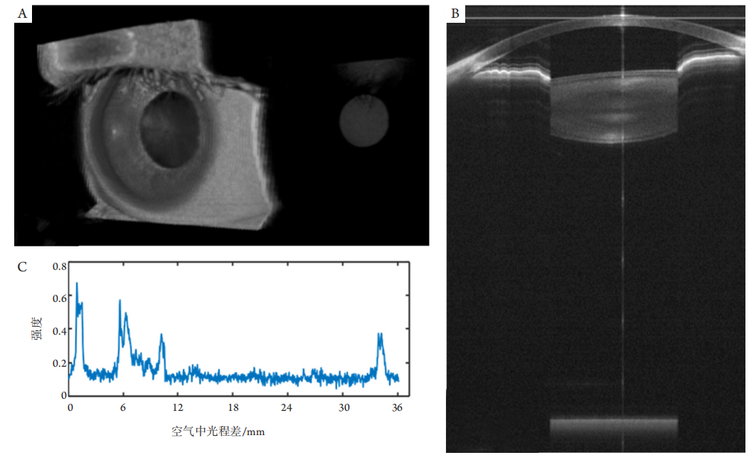 (A) The 3D rendering of the 3D OCT images of the whole eye. (B) One single OCT image of the whole eye. (C) The axial profile of human eye acquired with SS-OCT. Images were acquired using a custom-built 10 kHz, 1 060 nm SS-OCT system. Scale bar: 1 mm.