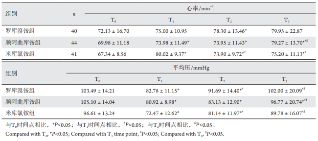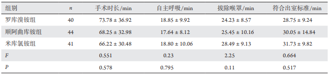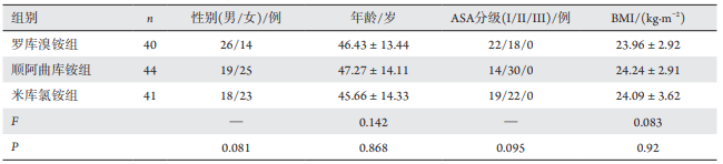 将135名符合条件的受试者按照1:1:1的随机化比例分配到罗库溴铵组、顺式阿曲库铵组和米库氯铵组。其中罗库溴铵组有5名患者、顺式阿曲库铵组有1名患者、米库氯铵组有4名患者的数据因眼压计测量出错、肌松药物应用出错等因素被剔除。罗库溴铵组、顺式阿曲库铵组和米库氯铵组3组患者的性别(P=0.081)、年龄(F=0.142,P=0.868)、ASA分级(P=0.095)、体重指数(body