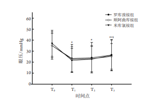 图1 三组患者在全身麻醉诱导过程中各时间点眼压的比较 Figure 1 Comparison of intraocular pressure during induction