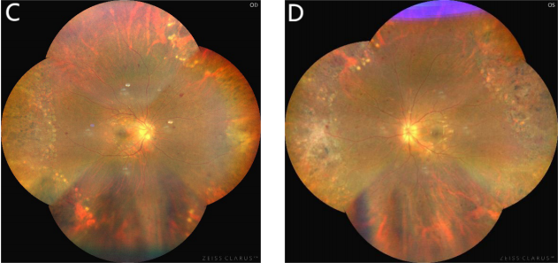 (A)It shows patchy hemorrhage, yellowish-white exudation and the frost-like dendritic changes of retinal vessels in the peripheral retina of the right eye except the superior temporal area;(B) It shows patchy hemorrhage, yellowish-white exudation and the frost-like dendritic changes of retinal vessels in the peripheral retina of the left eye except the inferior area. the lesion of nasal side in the left eye was more serious. (C, D) After 3 months of treatment, in both eyes,the frost-like dendritic changes of retinal vein disappeared, most of the retinal hemorrhage and exudation was absorbed, and laser spots were scattered in the peripheral retina.