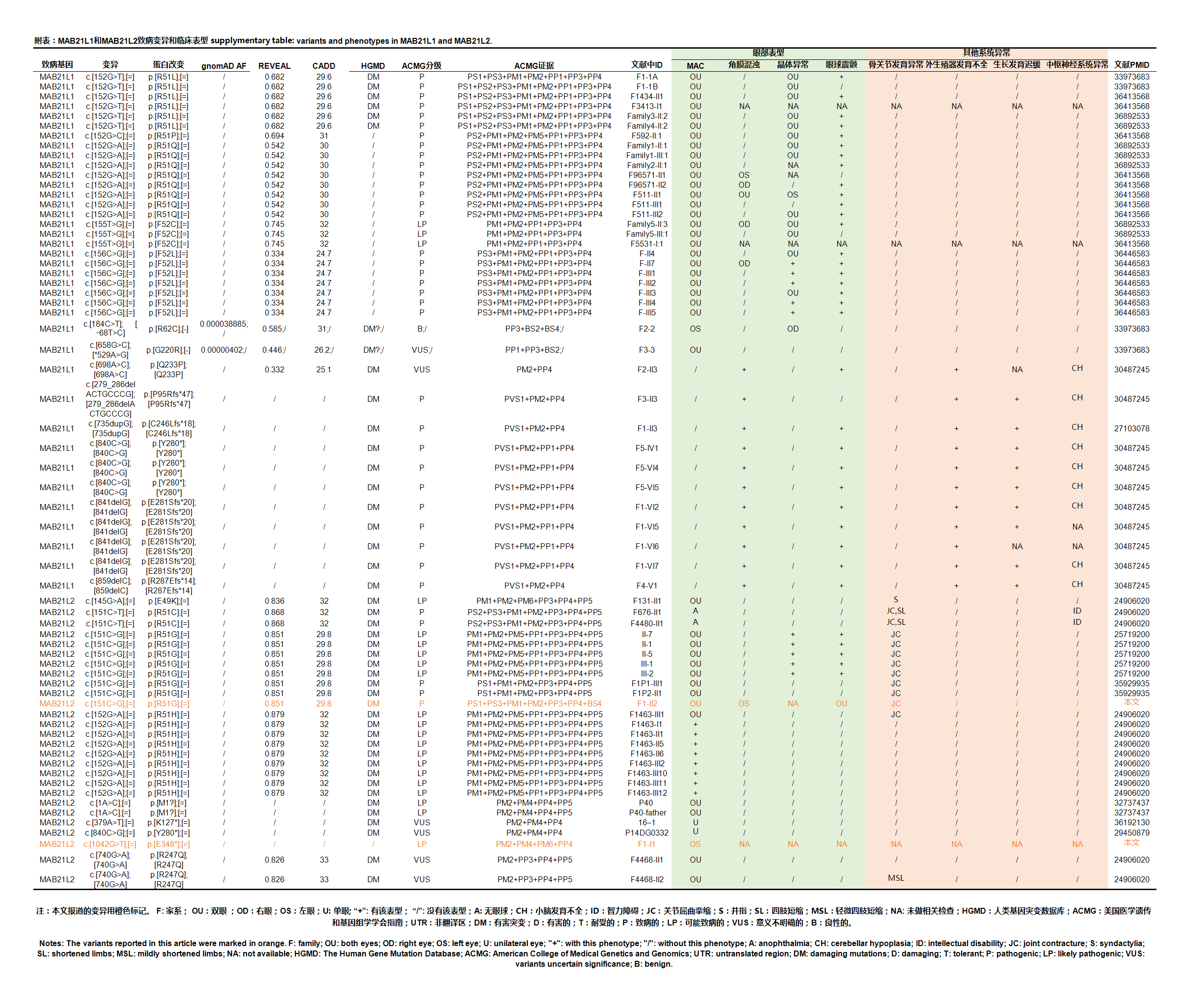 附表:MAB21L1和MAB21L2致病变异和临床表型 supplymentary table: variants and phenotypes in MAB21L1 and MAB21L2.