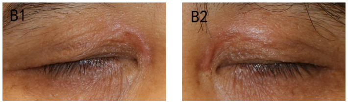 Notes: (A1 & A2) Before the laser treatment: there were flat yellow lesions on the inner side of the upper eyelid of both eyes with clear edges. The size of the lesions in the right eye was about 10 mm× 6 mm, and that in the left eye was about 15 mm× 6mm. (B1 & B2) One month after the fifth laser treatment: there was no lesion recurrence, minimal scar hyperplasia and pigmentation.