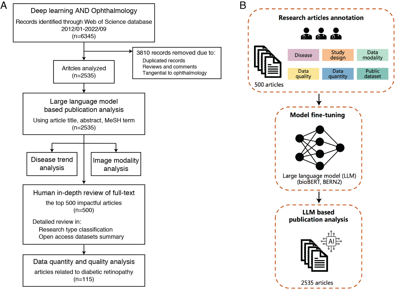Results: Researchers using LLM for literature analysis were 70% (p= 0.000 1) faster than those who did not, while achieving comparable accuracy (97% versus 98%, p = 0.768 1). The field of DL in ophthalmology has grown 116% annually, paralleling trends of the broader DL domain. The publications focused mainly on diabetic retinopathy (p = 0.000 3), glaucoma (p = 0.001 1), and age-related macular diseases (p = 0.000 1) using retinal fundus photographs (FP, p = 0.001 5) and optical coherence tomography (OCT, p = 0.000 1). DL studies utilizing multimodal images have been growing, with FP and OCT combined being the most frequent. Among the 500 high-impact articles, laboratory studies constituted the majority at 65.3%. Notably, a discernible decline in model accuracy was observed when categorizing by study design, notwithstanding its statistical insignificance. Furthermore, 43 publicly available ocular image datasets were summarized.