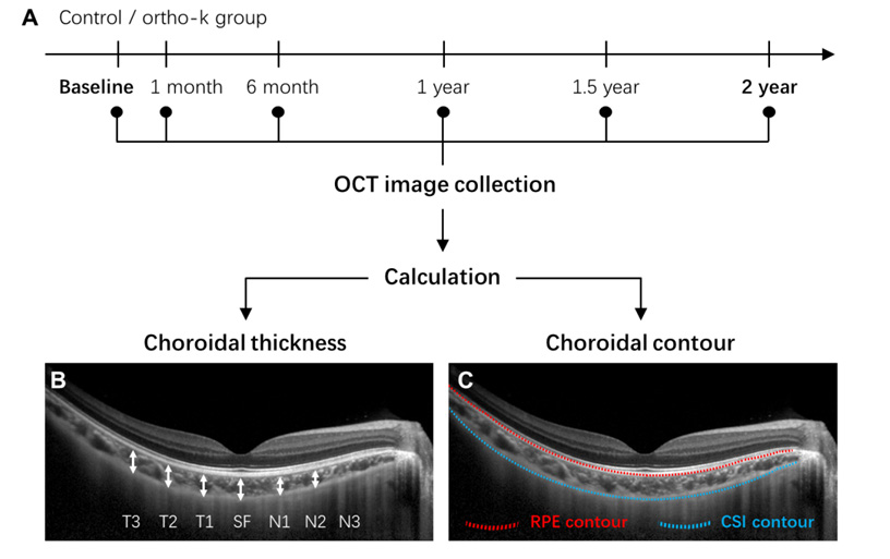 如图1所示,在对照组和Ortho-k组中,OCT图像在基线和1个月、6个月、1年、1.5年、2年时间点的随访中被采集。基于这些OCT图像计算脉络膜厚度和脉络膜轮廓。