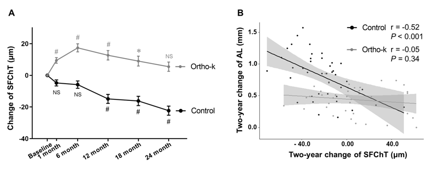 (A)对照组和Ortho-k组在基线和1、6、12、18、24个月的随访中SFChT的变化,误差条代表均值的标准误,*P<0.05,#P<0.001,均表示与基线相比;(B)散点图显示了2年SFChT的变化与2年AL的变化之间的关系。线性回归表明2年SFChT的变化与2年AL的变化之间呈负相关(r=-0.52,P<0.001),2年SFChT的变化与2年AL的变化之间的相关性不显著(r=-0.05,P=0.342)。