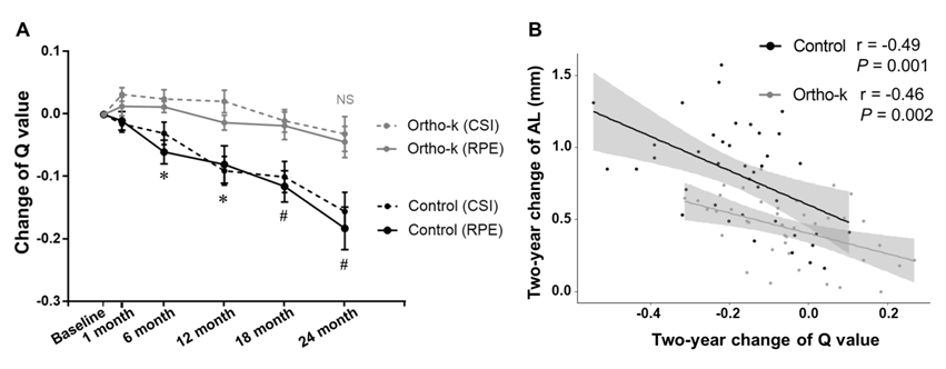 (A) Change of choroidal contour (Q value) at baseline, 1-, 6-, 12-, 18-, and 24-month visits in the control and ortho-k groups. Error bars represent standard errors of the mean. *P<0.05, #P<0.001 compared with baseline. (B) Scatterplots showing the relationship between the 2-year change of Q value and the 2-year change of AL. Linear regressions indicate a significant association between the 2-year change in Q value and the 2-year change of AL (r=-0.49, P<0.001); a significant association between the 2-year change of Q value and the 2-year change of AL (r=-0.46, P=0.002). The 2-year change of Q value represents the average of the change of RPE and CSI.