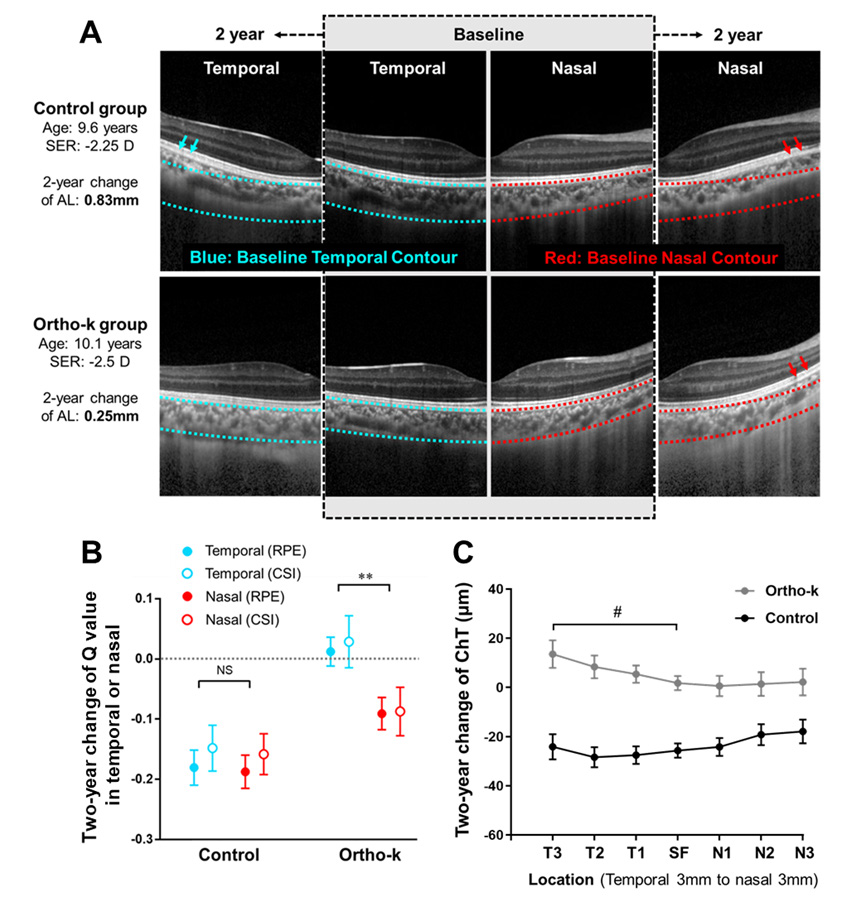 (A) OCT images of two representative subjects showing the temporal and nasal choroidal change in the control and ortho-k groups in 2 years. The baseline characteristics of these two subjects were similar. (B)Temporal and nasal change of choroidal contour (Q value) in the control and ortho-k groups in 2 years. Error bars represent standard errors of the mean.**P<0.01, compared temporal with nasial Q value. (C) Temporal and nasal change of choroidal thickness in the control and ortho-k groups in 2 years. Error bars represent standard errors of the mean. #P<0.001, compared temporal 3mm choroidal thickness with SFChT.