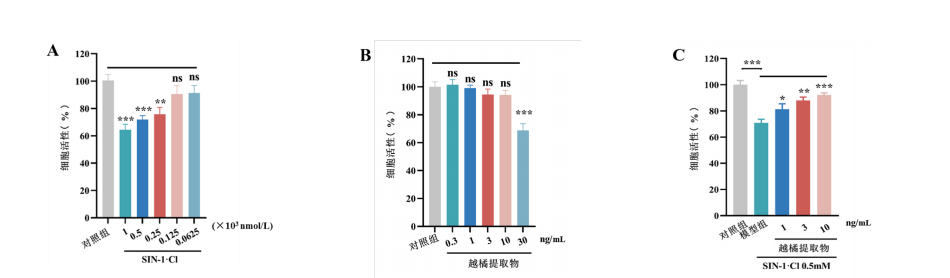 (A)不同浓度SIN-1对ARPE-19细胞活力的影响;(B) 不同浓度越橘提取物对ARPE-19细胞活力的影响;(C) 不同浓度越橘提取物对SIN-1处理后ARPE-19细胞活力的影响。组间比较,(A) (B)图与对照组比,(C)图与模型组比较,n=6,***表示P值<0.001 ,**表示P值<0.01 ,*表示P值<0.05。