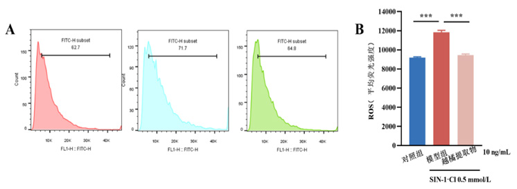 本研究使用不同浓度的越橘提取物处理经0.5 mmol/L SIN-1诱导氧化的ARPE-19细胞,并用流式细胞仪检测处理后细胞内的ROS水平。结果显示,SIN-1可诱导ARPE-19细胞内ROS水平升高,越橘提取物可降低SIN-1诱导的ARPE-19细胞内ROS水平(图2),显示出明显的抗氧化应激效果。