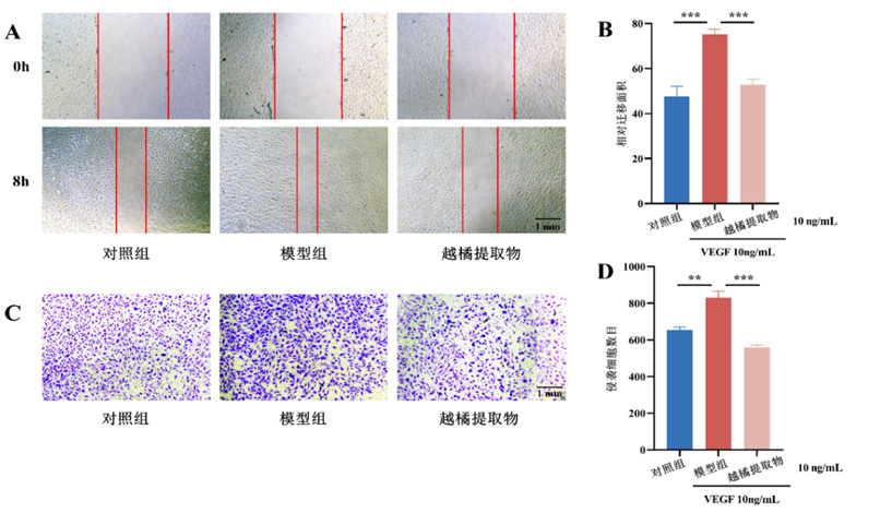 (A)越橘提取物对VEGF处理后的HUVEC迁移能力的影响(x4);(B)细胞迁移试验定量结果;(C)越橘提取物对VEGF处理后的HUVEC侵袭能力的影响(x4);(D)细胞侵袭试验定量结果。组间比较,与模型组比较,n=6,***P<0.001 0,**P<0.01。