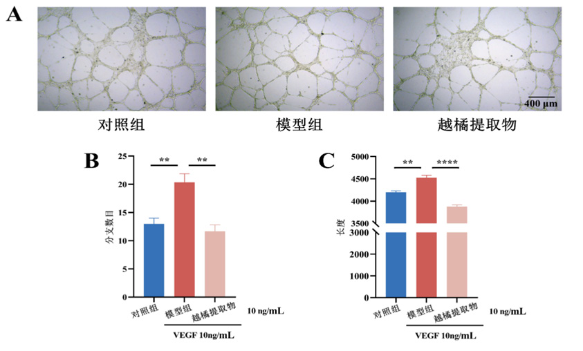 (A)越橘提取物对VEGF引起的血管生成的影响(x10);(B)血管生成试验分支数目定量结果;(C)血管生成试验管长定量结果。组间比较,与模型组比较,n=6,**P<0.010,****P<0.000 1。