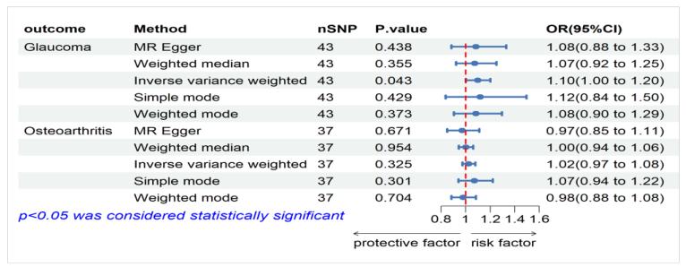 综上所述,本研究使用双向 MR 研究方法, 结果表明OA与青光眼发病风险具有正相关的因果关联,而青光眼对OA则无因果关联。