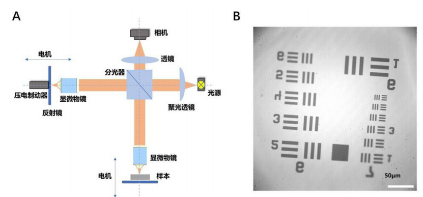 (A)双模态FFOCT成像系统光路设计图;(B)分辨率板成像验证。标尺:50 μ m。