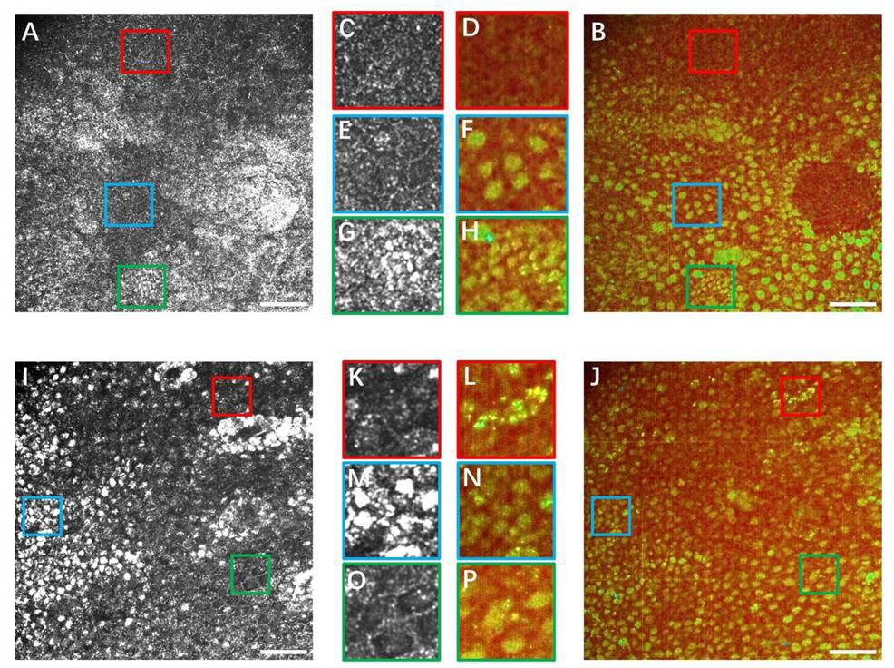 (A, B) Static and dynamic images of superficial epithelium at the limbus; (C-H) Imaging manifestations of different cell types in the superficial epithelium; (I, J) Static and dynamic images of basal epithelium at the limbus; (K-P) Imaging manifestations of different cell types in the basal epithelium. Scale bar: 50 μ m.