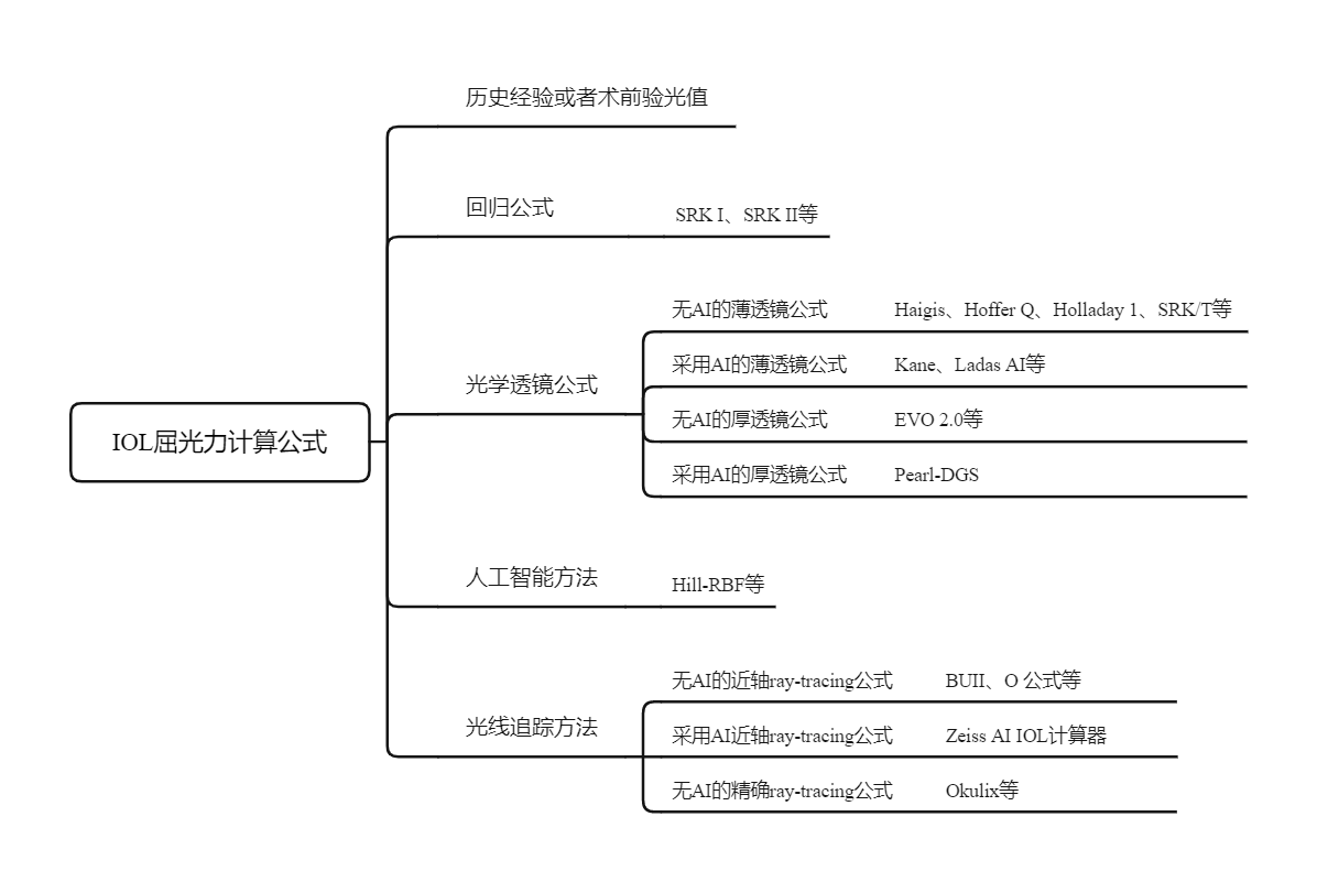 5) Ray-tracing光线追踪方法,根据是否采用AI方法计算优化进一步划分:①无AI的近轴ray-tracing公式,如Barrett Universal II(BUII)、O公式、Olsen公式等;②采用AI近轴ray-tracing公式,如Zeiss AI IOL计算器(未公开)等;③无AI的精确ray-tracing公式,如Okulix、Olsen ray tracing(Pentacam随机公式)等。
