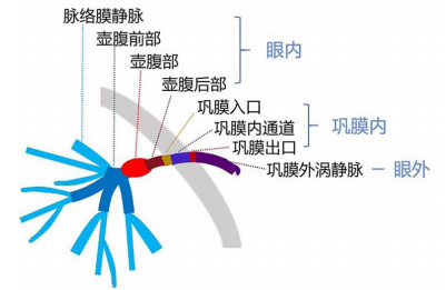 • 脉络膜涡静脉具有精细的解剖特征和层次:根据其在眼球的位置,分为眼内、巩膜内和眼外三个主要部分;根据其解剖学位置,又进一步分为脉络膜静脉、壶腹前部、壶腹、壶腹后部、巩膜入口、巩膜内通道、巩膜出口和巩膜外涡静脉八个区域。