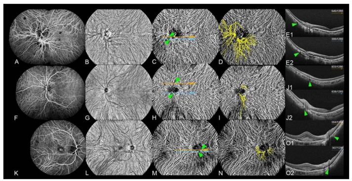 A-E2. Two PVVs located around the optic disc in an eye with punctate inner choroidopathy. A. Detection of two PVVs around the optic disc using ICGA venous phase. B. Detection of two PVVs around the optic disc using 24mm × 20 mm en face WF-OCTA in the large-vessel choroidal layer. C. WF-OCTA image showing the large-vessel choroidal layer in the same scan as B, with two horizontal lines (orange and blue arrows) crossing the exit points of PVVs (green arrowheads). D. Yellow highlight indicating the presence of two PVVs around the optic disc in C. E1. Horizontal WF-OCT image of C (orange arrow) corresponds to the 646th scan out of a total of 1280 WF-OCT scans, clearly demonstrating the exit of one PVV penetrating the sclera (green arrowhead) and leaving the eyeball. E2. Horizontal WF-OCT image of C (blue arrow) corresponds to the 596th scan out of a total of 1 280 WF-OCT scans, clearly illustrating the exit of another PVV penetrating the sclera (green arrowhead) and leaving the eyeball. F-J2. One PVV located around the optic disc in an eye with acute zonal occult outer retinopathy. F. Detection of one PVV around the optic disc using ICGA venous phase. G. Detection of one PVV around the optic disc using 24mm × 20 mm en face WF-OCTA in the large-vessel choroidal layer. H. WF-OCTA image showing the large-vessel choroidal layer in the same scan as F. I. Yellow highlight indicating the presence of one PVV around the optic disc in G. J1. Horizontal WF-OCT image of H (orange arrow) corresponds to the 833th scan out of a total of 1280 WF-OCT scans, clearly demonstrating the exit of one PVV penetrating the sclera (green arrowhead) and leaving the eyeball. J2. Horizontal WF-OCT image of H (blue arrow) corresponds to the 638th scan out of a total of 1280 WF-OCT scans, clearly demonstrating the exit of one PVV penetrating the sclera (green arrowhead) and leaving the eyeball. K-O2. Two PVVs located around the optic disc in an eye with polypoidal choroidal vasculopathy. K. Detection of two PVVs around the optic disc using ICGA venous phase. L. Detection of two PVVs around the optic disc using 24mm × 20 mm en face WF-OCTA in the large-vessel choroidal layer. M. WF-OCTA image showing the large-vessel choroidal layer in the same scan as J. N. Yellow highlight indicating the presence of two PVVs around the optic disc in K. O1. Horizontal WF-OCT image of M (orange arrow) corresponds to the 594th scan out of a total of 1280 WF-OCT scans, clearly demonstrating the exit of one PVV penetrating the sclera (green arrowhead) and leaving the eyeball. O2. Horizontal WF-OCT image of M (blue arrow) corresponds to the 567th scan out of a total of 1280 WF-OCT scans, clearly illustrating the exit of another PVV penetrating the sclera (green arrowhead) and leaving the eyeball. The figure is from the author's own published paper.[46]