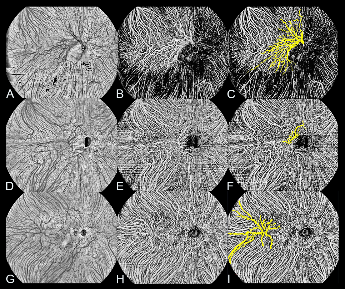 A-C. PVV located around the optic disc in a healthy eye. A. Detection of PVV around the optic disc using 24mm × 20 mm en face WF-OCTA in the large-vessel choroidal layer. B. WF-OCTA image showing the large-vessel choroidal layer in the same scan as A. C. Yellow highlight indicating the presence of PVV around the optic disc in B. D-F. PVV located at the macula area in another healthy eye. D. Detection of PVV at the macula area using 24mm × 20 mm en face WF-OCTA in the large-vessel choroidal layer. E. WF-OCTA image showing the large-vessel choroidal layer in the same scan as D. F. Yellow highlight indicating the presence of PVV at the macula area in E. G-I. PVV located at other areas of the posterior pole in another healthy eye. G. Detection of PVV at other areas of the posterior pole using 24mm × 20 mm en face WF-OCTA in the large-vessel choroidal layer. H. WF-OCTA image showing the large-vessel choroidal layer in the same scan as G. I. Yellow highlight indicating the presence of PVV at other areas of the posterior pole in H. The figure is from the author's own published paper.[46]