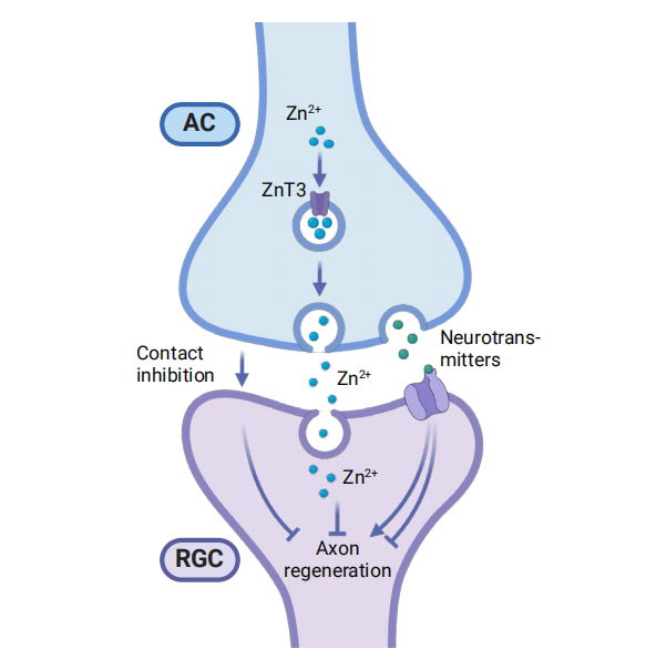 A decade later, direct evidence emerged regarding AC-regulated optic nerve regeneration. Reports indicated that ionic zinc (Zn2+) accumulates in ACs processes promptly after optic nerve crush and continues to rise for the first 24 hours. Zn2+ is subsequently transferred to RGCs via synaptic vesicular release, thereby suppressing RGC survival and axon regeneration (Figure 2).[75] By genetically deleting the Zn2+ transporter 3 (ZnT-3) or chelation with TPEN, Zn2+ release from ACs is reduced, promoting optic nerve regeneration and maintaining RGCs survival for 3 months. Additionally, Zn2+ chelation exhibits a potent synergistic effect when combined with canonical pro-regenerative manipulations, such as Ptenknockout and Klf9 knockout.[75-76]
