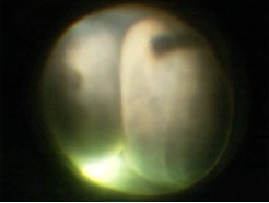 图2 术中显微镜下见鼻侧及颞侧视网膜脉络膜棕红色球形 隆起,对吻面积大,窥不清眼底视乳头及黄斑区结构