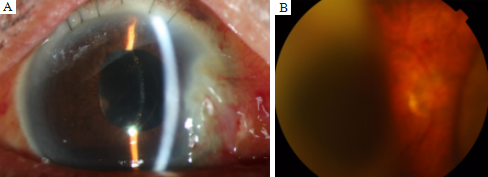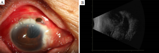 (A)The corneal of the right eye was mild edema with the folds of the corneal posterior elastic layer, part of the iris incarcerated in the corneal incision, and the pupil shifted upward; (B) Ocular B ultrasound showed the suprachoroidal hemorrhage in the right eye.