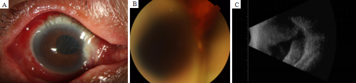 (A)The iris of the right eye returned to the anterior chamber and the pupil was nearly round; (B) Two brown-red spherical chorioretinal bulges were shown in the fundus with the optic disc visible vaguely; (C) Ocular B ultrasound showed the reducing of choroidal detachment as well as the absorption of the suprachoroidal hemorrhage in the right eye.