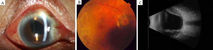 (A)The corneal and aqueous humor was clear, the anterior chamber was deep, and the pupil shifted to the temporal and upper side, like a water drop; (B) The choroidal detachment obviously reduced, with the optic disc and macular area visible; (C) Ocular B ultrasound showed the choroidal detachment obviously reduced in the right eye.