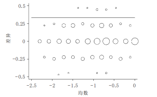 图1 两次测量结果的差异均数, 中间线条代表差异均数, 圆圈大小代表在符合该测量差异的儿童数量, 上下线条是重复性系数的范围。