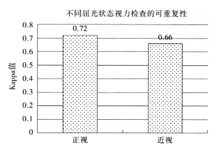 图 4 Kappa 分析结果显示不同屈光状态的儿童视力检查可重复性不同, 正视眼的视力检查可重复性较好, 而近视眼的视力检查可重复性相对近视组稍差。