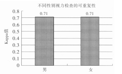 图 2 Kappa 分析结果显示不同性别视力检查可重复性结果在性别之间无明显不同。