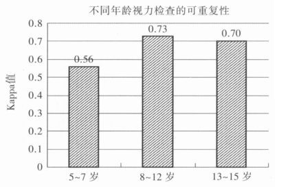 图 3 Kappa 分析结果显示 8 ~12 岁儿童的视力检查可重复性与 13 ~15 岁儿童类似, 而 5 ~7 岁儿童的视力检