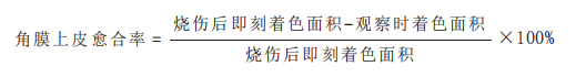 伤后 12 h、第 1 天至第 14 天, 每天裂隙灯显微镜检查, 荧光素染色观察角膜上皮缺损及荧光素着色面积并照相, 照片经计算机图像分析系统处理, 用以下公式[5] 计算角膜上皮愈合率: