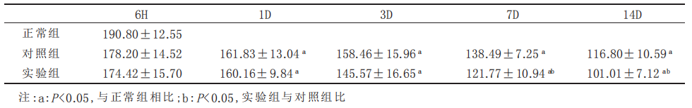 采用 SPSS13.0 统计软件进行统计学分析, 所有实验数据采用 X̄±s 表示, 组间差异采用两独立样本t 检验, 组内不同时间点差异采用单因素方差分析, LSD-t 检验。
