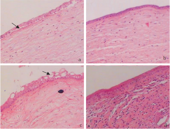 ( a) 烧伤后 7 d 对照组新生上皮为 2 ~3 层扁平细胞平行排列, 新生上皮与基质层间可见空泡( 箭头所示) ;(b) 烧伤后 7 d 实验组新生上皮细胞间, 上皮与基质间均连接紧密;(c) 烧伤后 14 d 对照组新生上皮中表层扁平细胞和底层立方细胞间存在空泡( 箭头所示) , 排列紊乱, 结构松散; (d) 烧伤后 14 d 实验组新生上皮复层细胞排列规则、紧密HE×100