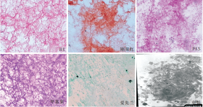 病理检查: 玻璃体变性的确诊有赖于术中的玻璃体标本涂片的病理检查。HE 染色为无定形物质,刚果红呈特征性红色,甲基紫、PAS 染色呈紫色, 爱先兰染色呈蓝色。另外, 电镜下我们观察到直径 5~10 nm 的纤维丝状物, 长短不一, 聚集呈束。所有病理结果均提示玻璃体呈淀粉样变性(图2) 。