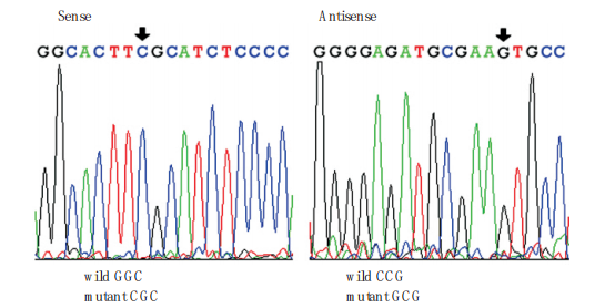 图 3 外周血 DNA 双向测序结果, TTR 基因第 3 个外显子由 GGC 突变为 CGC