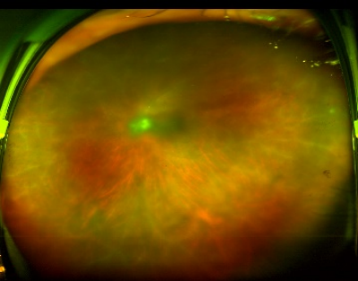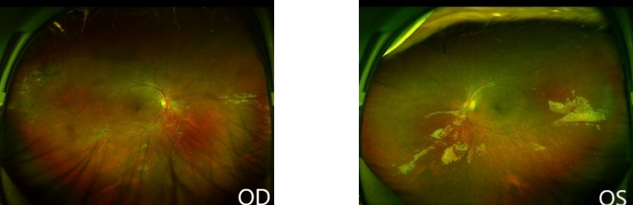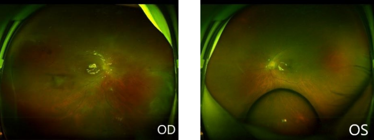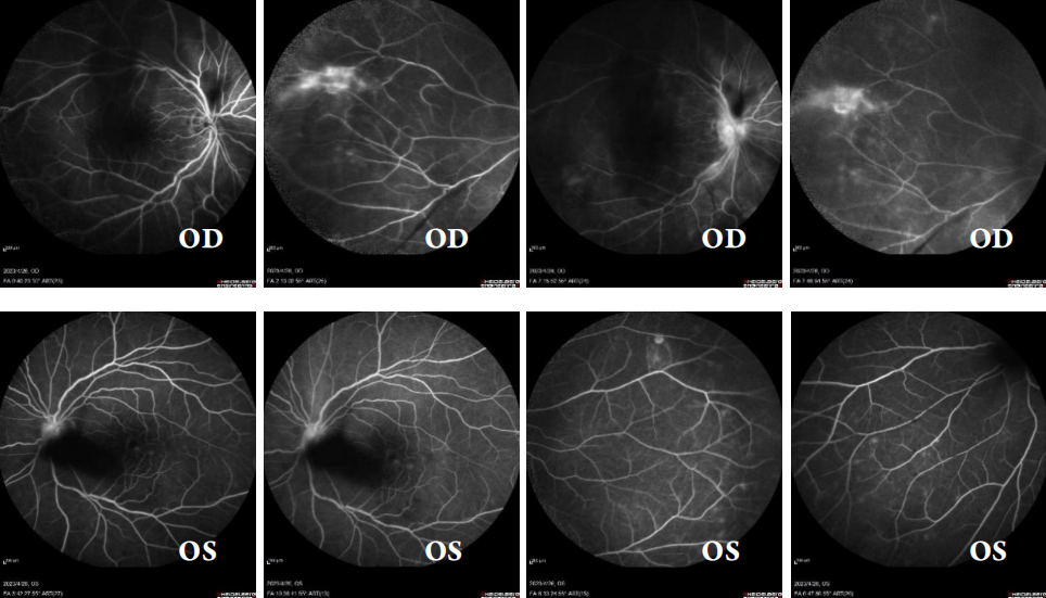 右眼视网膜前大量不规则可移动遮挡荧光,视盘毛细血管扩张渗漏,视网膜末梢血管广泛渗漏,后期视盘呈强荧光,边界不清。左眼视盘前可见片状遮蔽荧光,鼻上视盘毛细血管可见渗漏,边界不清,周边视网膜末梢可见团状荧光,后期黄斑区血管末梢轻度荧光素渗漏。
