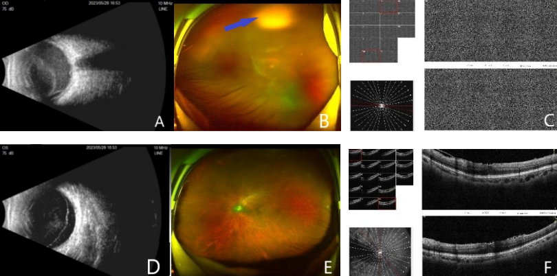 (A)B-mode ultrasonography of the right eye: Continuous band echo can be detected in the vitreous body of right eye. There are a lot of weak point echo between the band echo area and the bulbar wall, which is not connected with the bulbar wall echo. (B)Scanning laser ophthalmoscope (SLO) of the right eye: A blurry white mass of solid opacity is visible over the retina. (C)Optical coherence tomography(OCT)of the right eye: Cannot see into. (D)B-mode ultrasonography of the left eye: A lot of weak echo and smooth band echo were detected in the vitreous cavity of the left eye. (E)SLO of the left eye:Leopard-print change in the fundus, tinfoil-like reflection in the macular region. (F)OCT of the left eye: There is a high reflection band on the inner surface of retina, the thickness of macula increases, the retinal structure is less continuous and the local low reflection.
