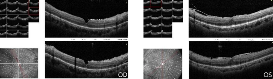 The inner surface of the retina in the right eye was highly reflective and the structure of the retina was not continuous, while the inner surface of the retina in the left eye adhered to a strip of high reflection, the thickness of fovea increased and the structure of the retina was not continuous.