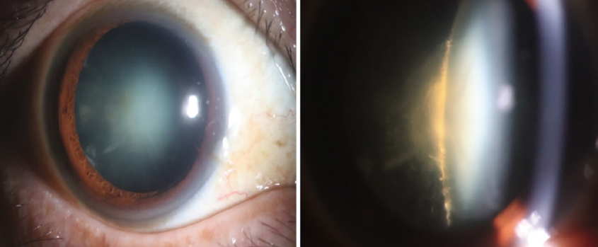 The preoperative photograph of anterior segment captured by slit lamp shows the cornea of the right eye is enlarged, the anterior chamber is deepened, and lens nucleus and posterior subcapsular opacity are observed after mydriasis.